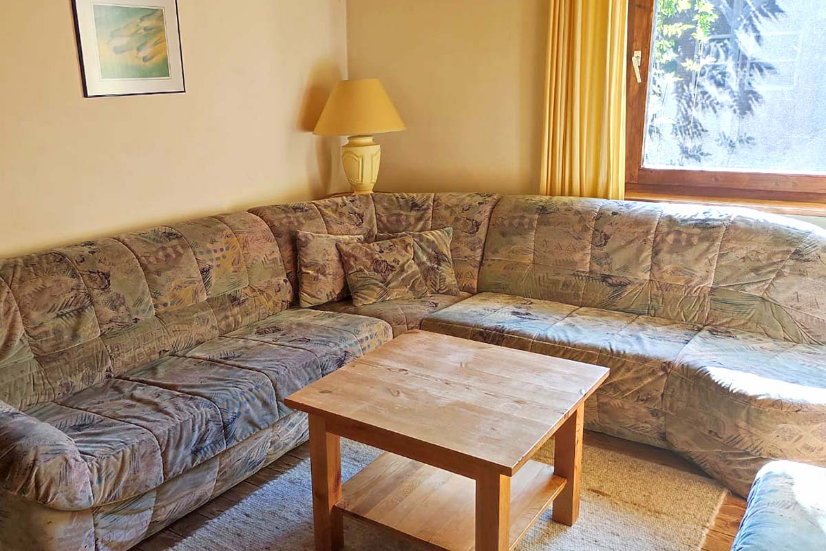 - Wohnzimmer mit Ecksofa, Holztisch und TV – direkt angrenzend an den Essraum